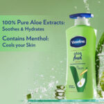 Vaseline Intensive Care Aloe Fresh Body Lotion is enriched with 100% pure aloe vera extracts and microdroplets of Vaseline jelly, restores skin’s moisture and helps maintain 24 hour hydration in skin. Aloe vera has long been used as a home ready to deal with dry flaky skin. It’s believed to have soothing properties to restore smooth supple skin and is effective at improving skin hydration. Aloe vera is an effective skin-conditioning which calms the skin and leaves it feeling deeply moisturized. Vaseline Jelly creates an extra layer of protection, preventing moisture from escaping and helping aid your skin’s natural recovery process.